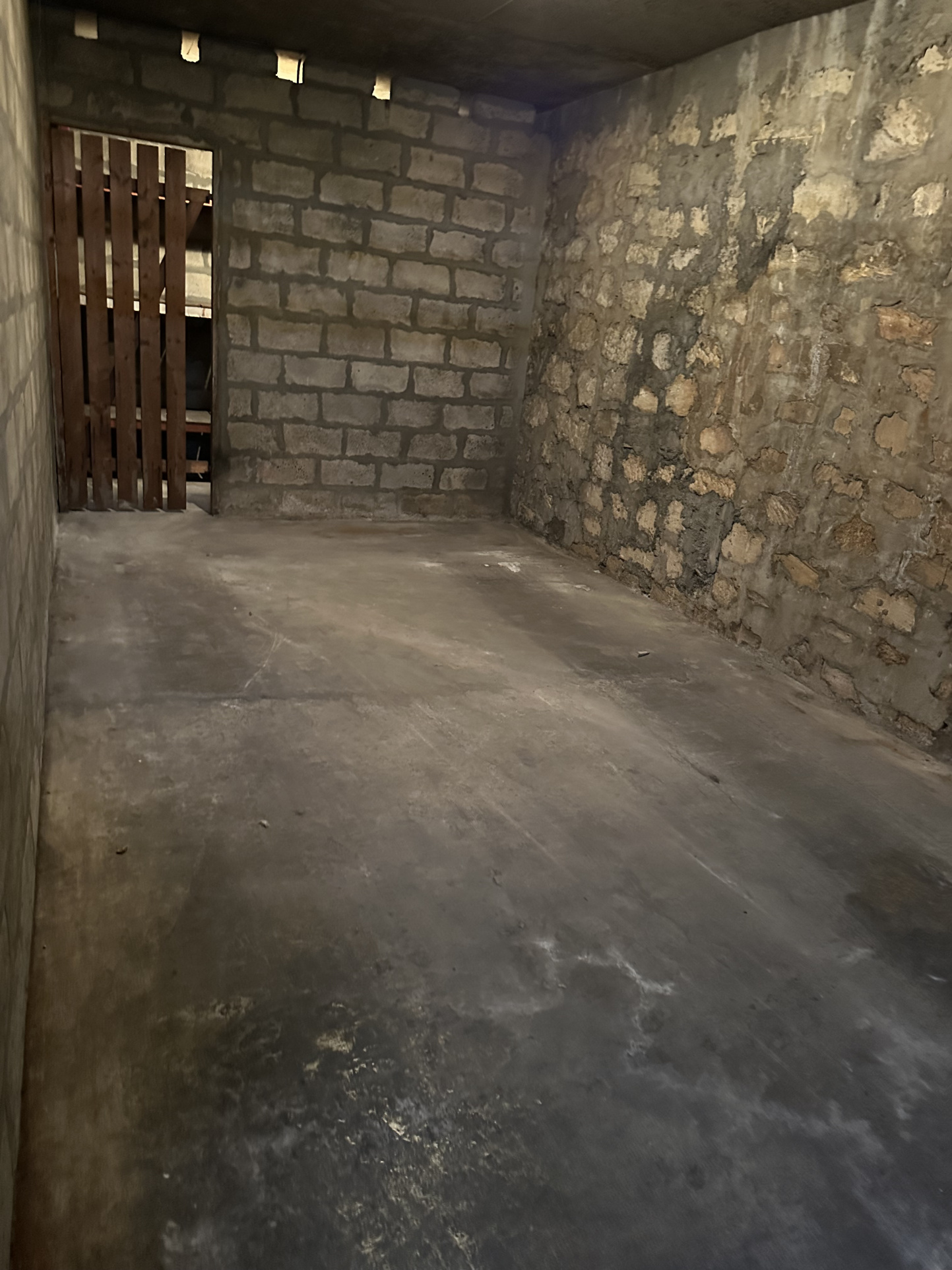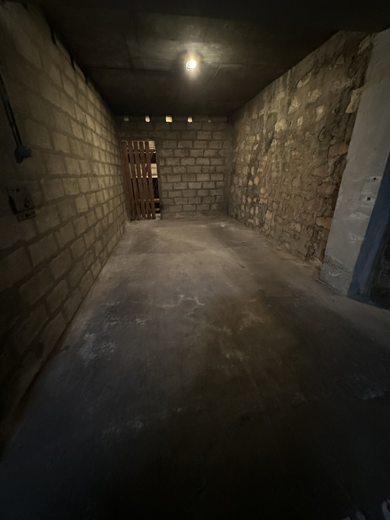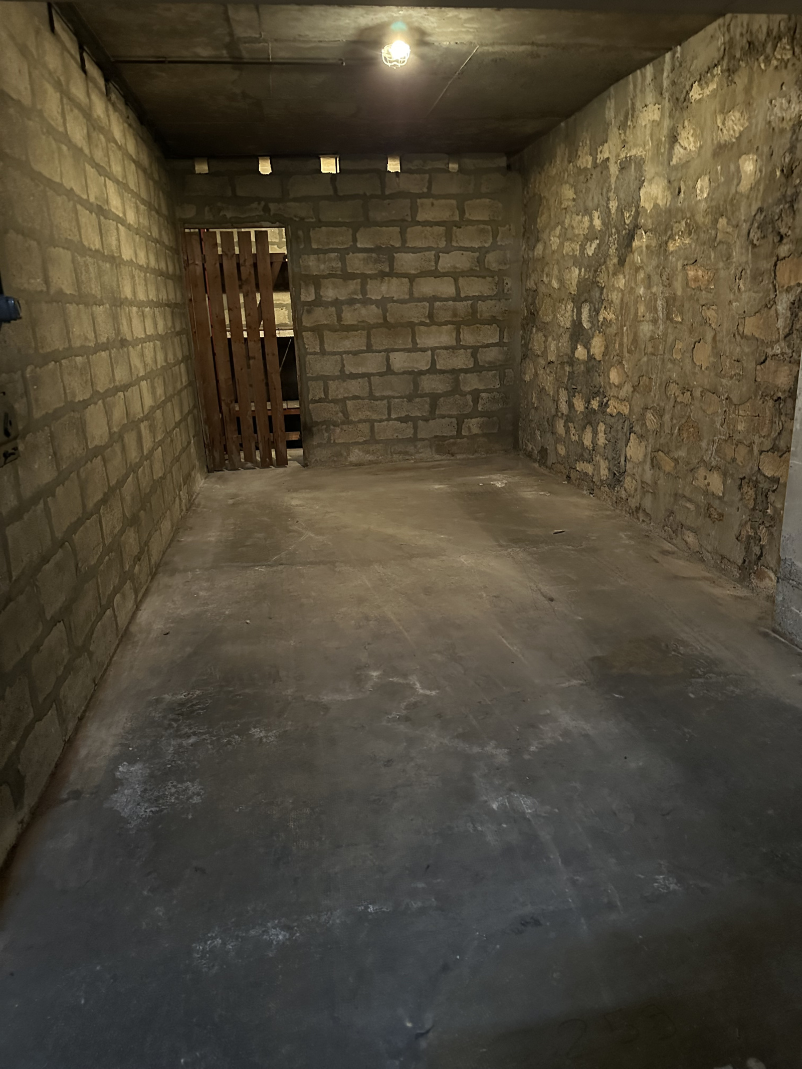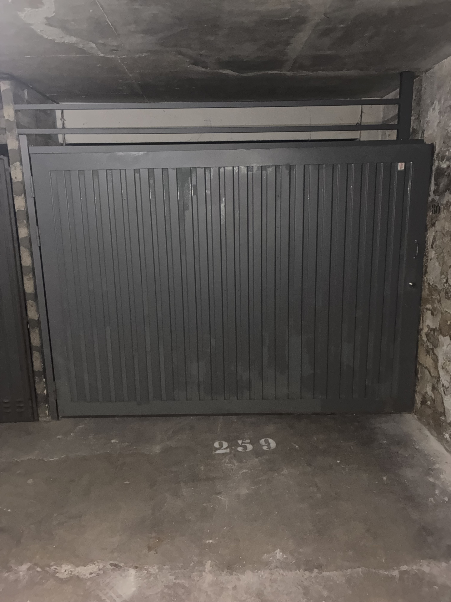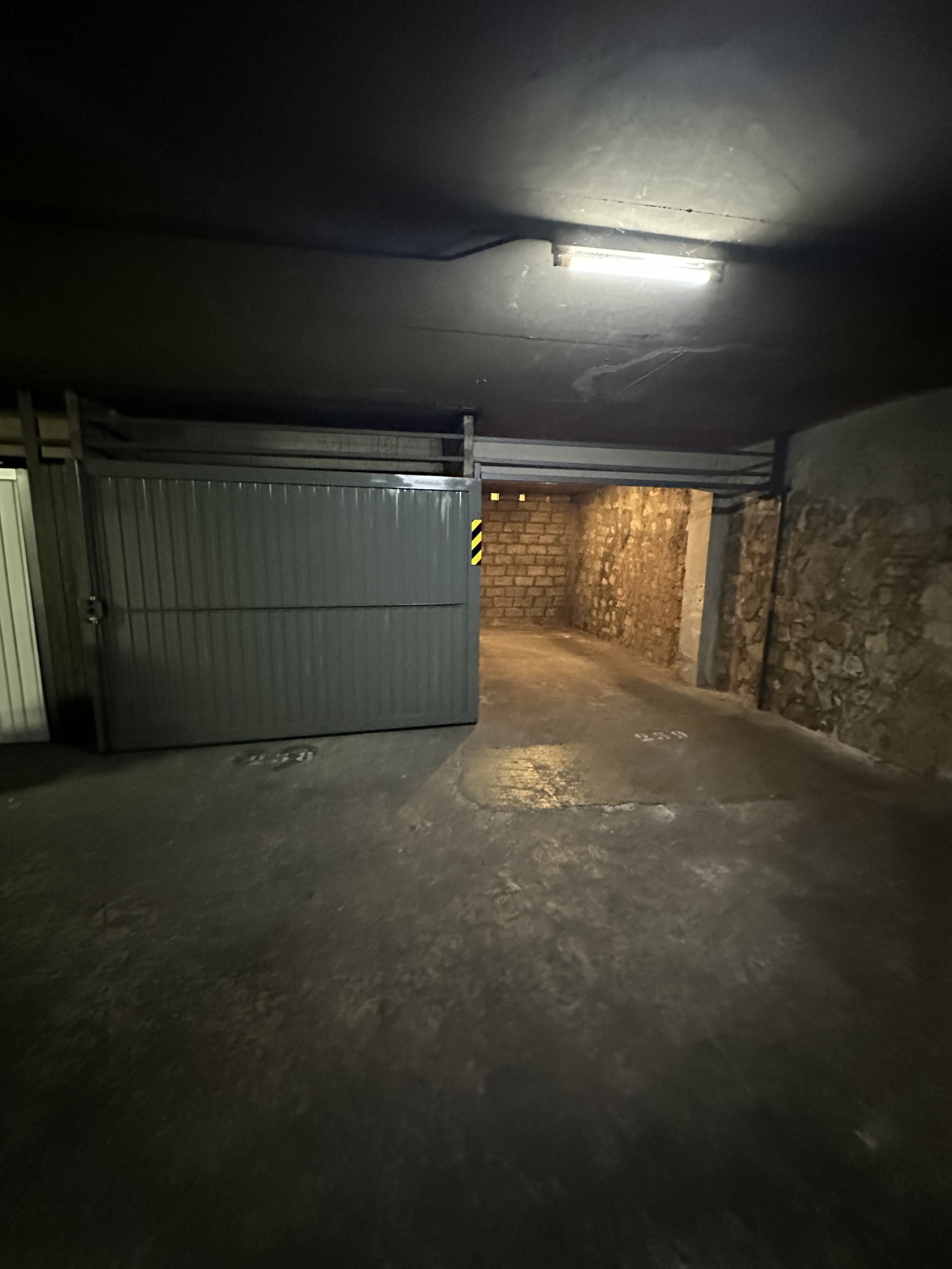 La porte est en parfait état et le box comprend un espace cave intégré, offrant un rangement supplémentaire très pratique.