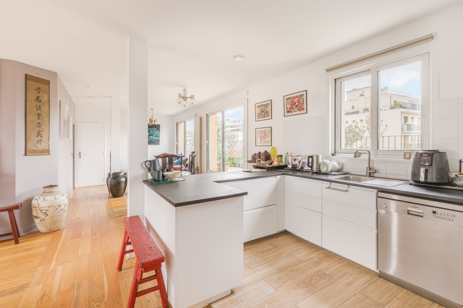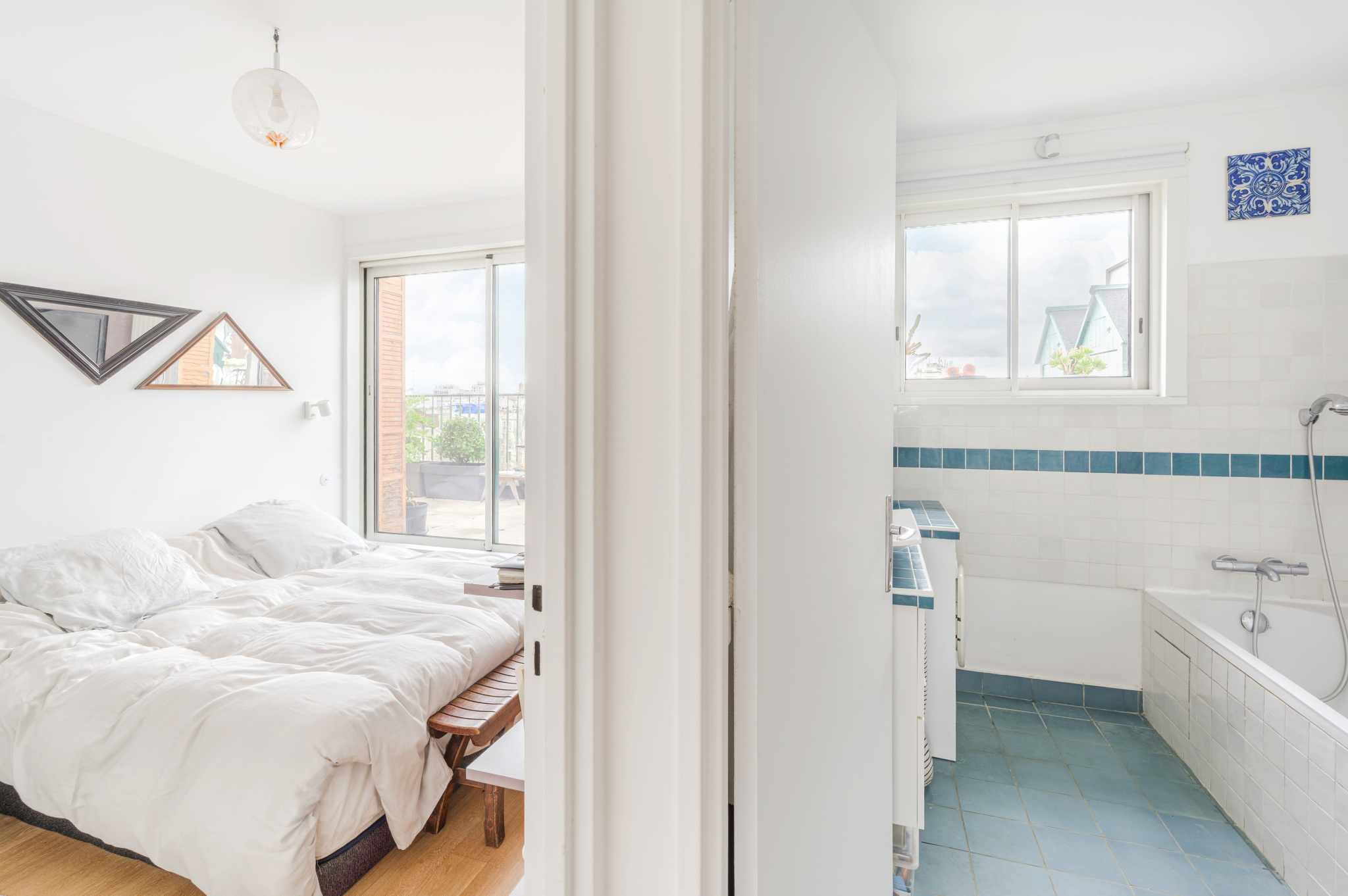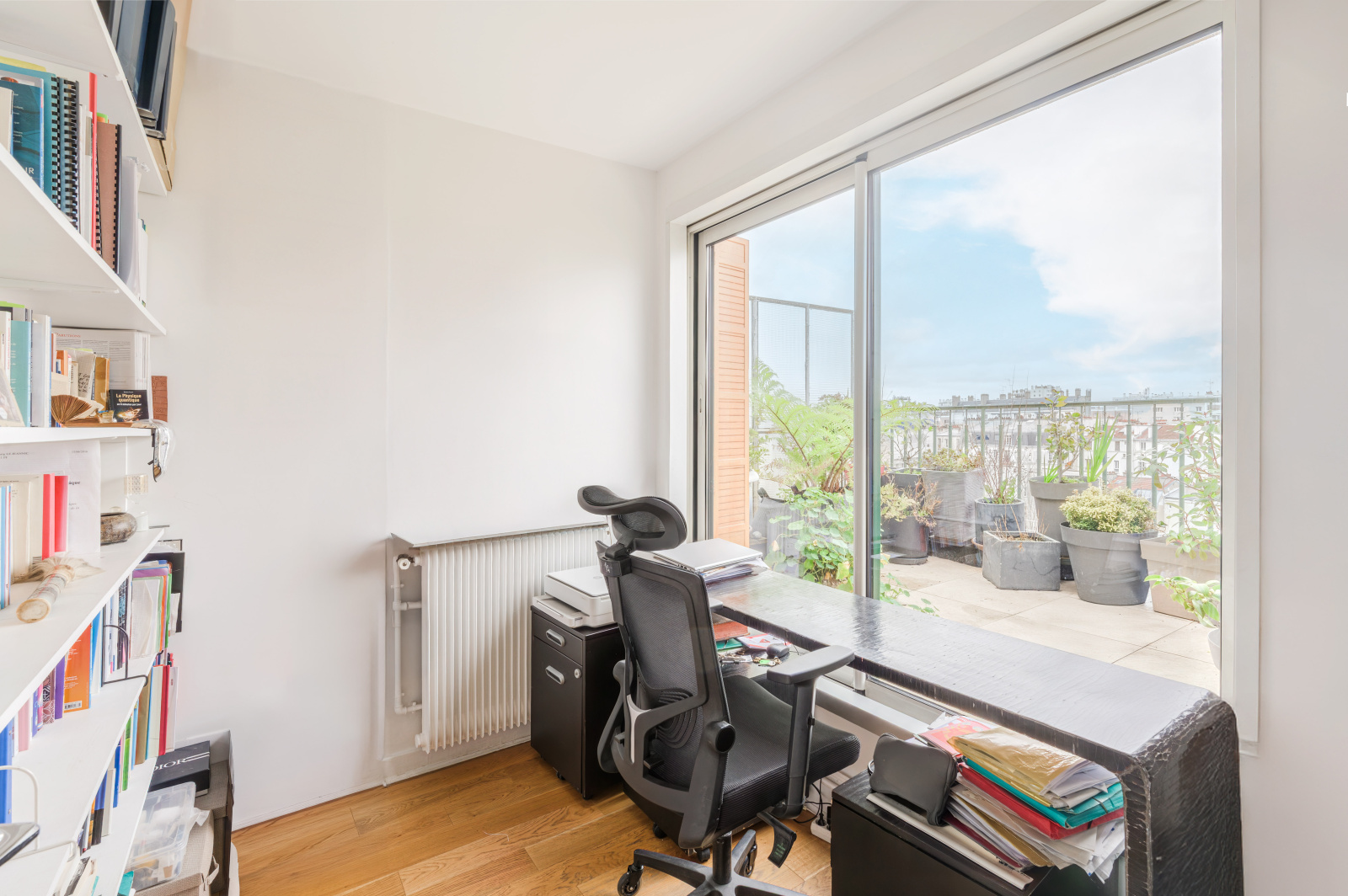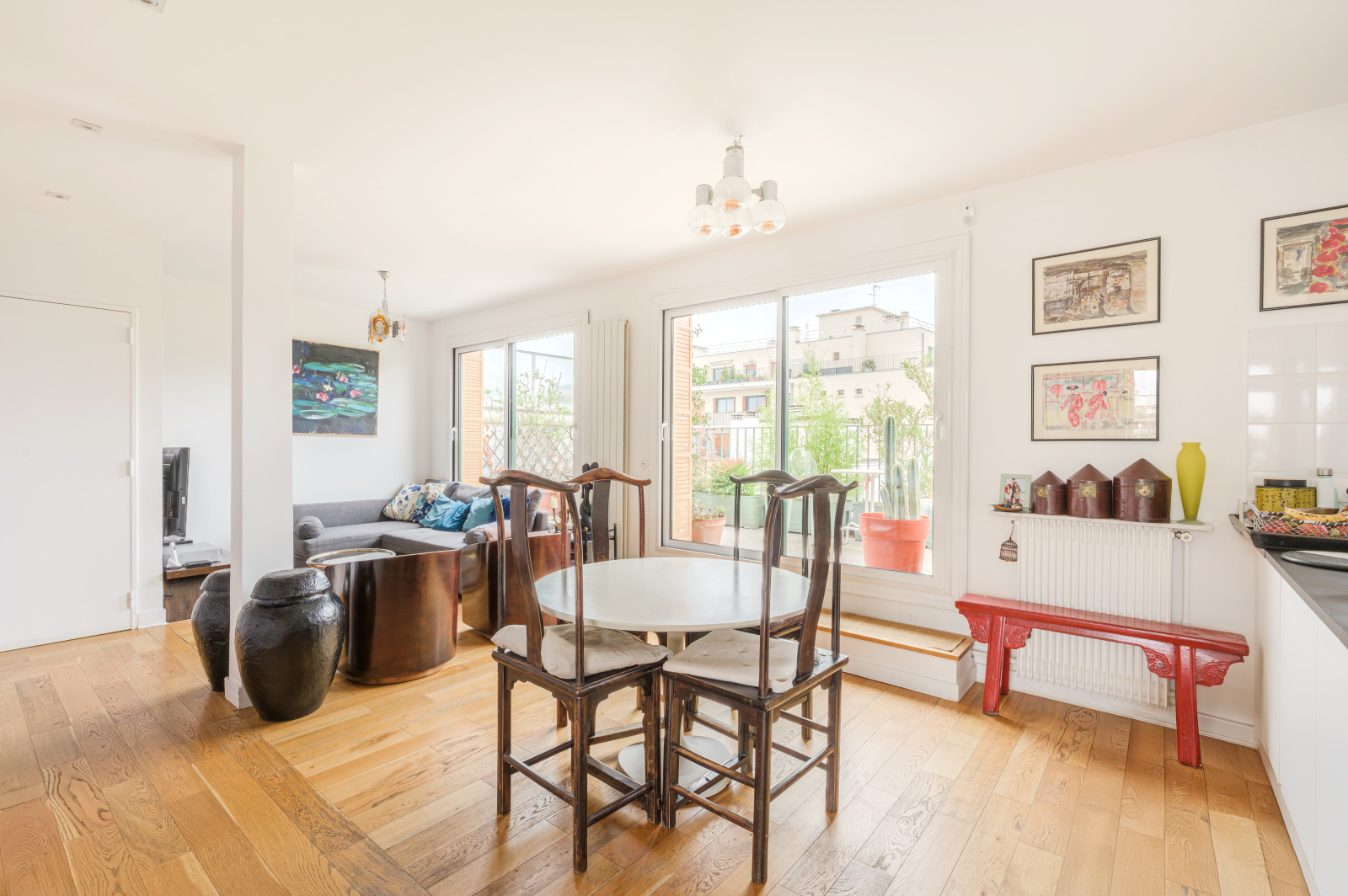 Ce 4 Pièces se compose d’une entrée avec grande cuisine ouverte sur un double séjour donnant accès aux deux terrasses de 30 m² chacune (l’une orientée Est, l’autre Ouest). Une pièce actuellement aménagée en bureau peut faire office de chambre supplémentaire. Vous y trouverez également un WC indépendant, une salle de bains, ainsi qu’une chambre ouvrant sur la terrasse. De nombreux placards et penderies complètent l’ensemble.