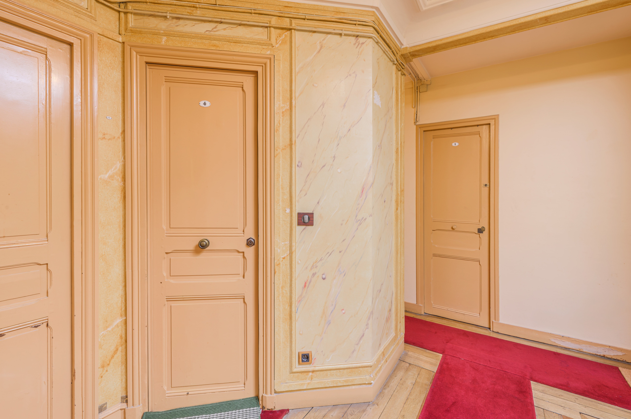 Dans une voie privée calme, au 6ᵉ étage d’un immeuble avec ascenseur (desservant jusqu’au 5ᵉ), chambre de bonne de 9,95 m² en bon état.