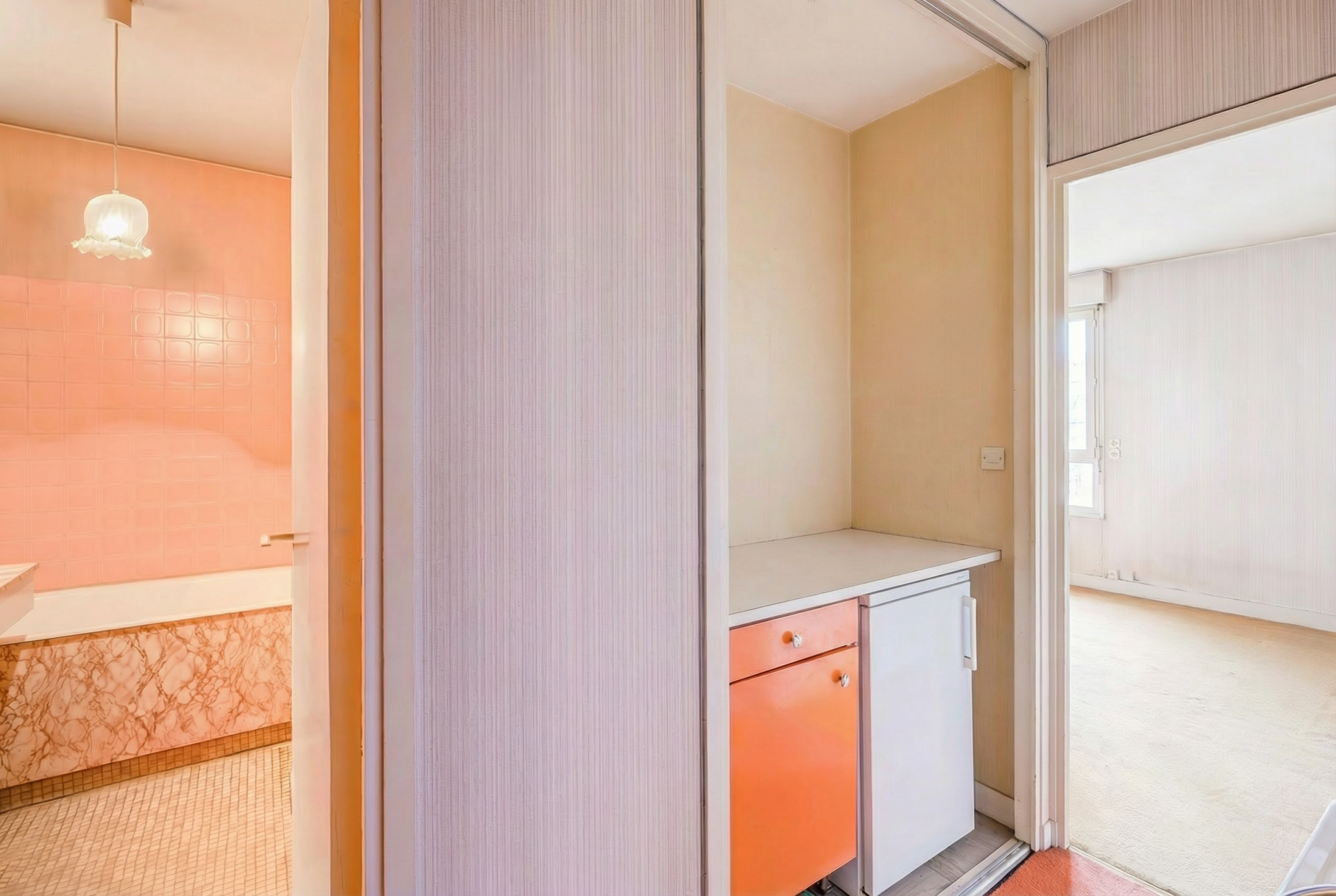 Il se compose d’une entrée avec rangements, d’une salle de bains avec WC, d’une kitchenette et d’un espace séjour modulable, permettant la création d’une cuisine ouverte afin d’agrandir la pièce de vie. L’appartement donne côté cour, offrant un environnement calme. Des travaux sont à prévoir.