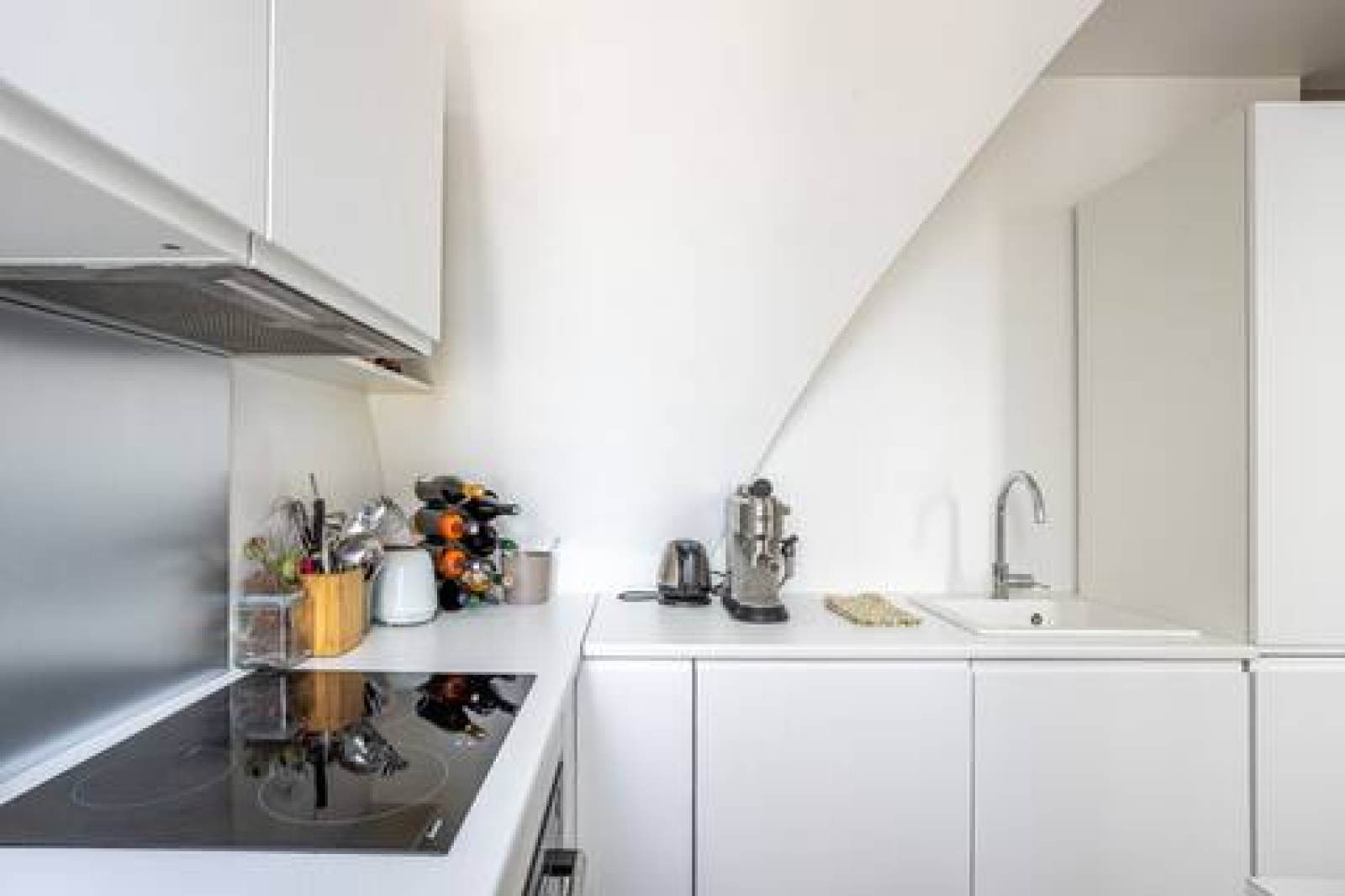 Au 6ᵉ et dernier étage avec ascenseur, superbe appartement entièrement rénové de 44,85 m², comprenant : une entrée, une belle pièce de vie bénéficiant d'une grande hauteur sous plafond avec poutres apparentes, une cuisine entièrement équipée, une chambre, une salle d’eau, ainsi que des WC indépendants.